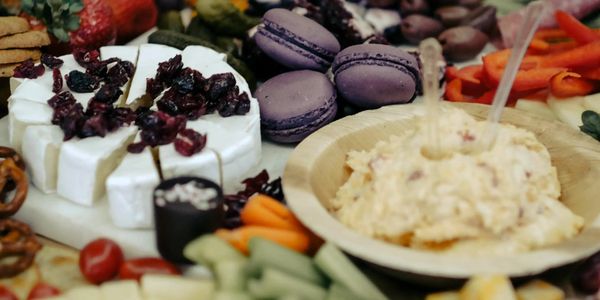 This lavish grazing table crafted on a table runner is 100% compostable. All items on the Grazing Table, including platters and serving utensils, can be rolled up on the table runner at the end of the event and disposed.